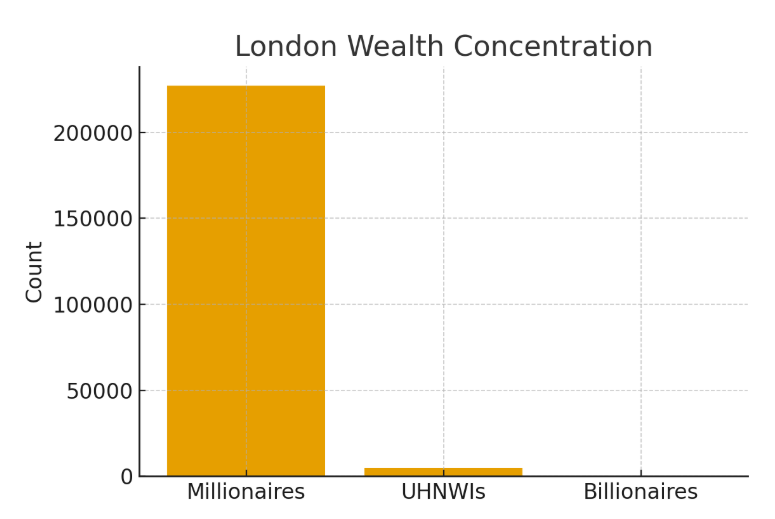 London has around 227,000 millionaires, 4,750 UHNWIs and 36 billionaires as of 2025, with wealth up ~3.8% year-on-year.