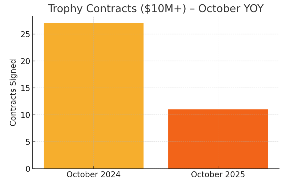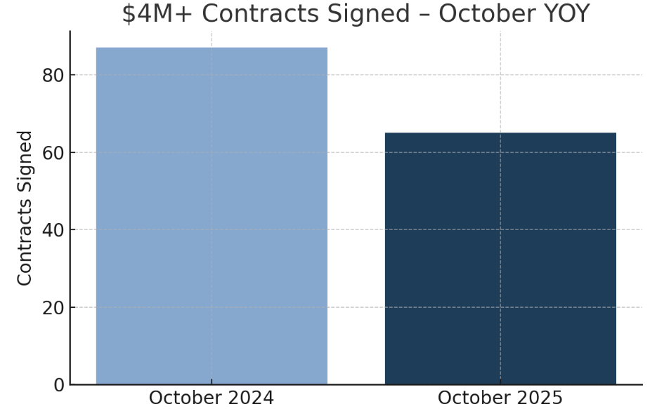 In the latest week reported, the $4M+ market recorded approximately 27 contracts signed, indicating a clear rebound in activity after the summer slowdown.