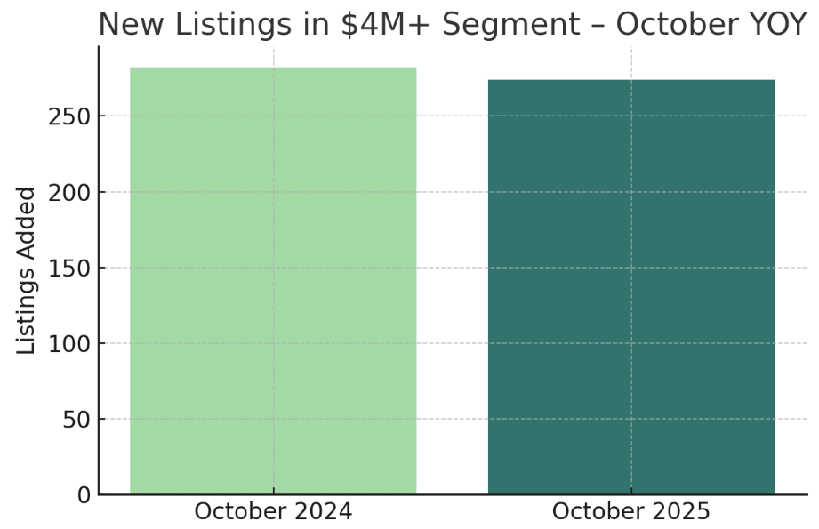 New listings in the $4M+ segment rose roughly 46 percent week-over-week, totaling about 274 new listings over 30 days. Despite the spike, this is still 3 percent lower year-over-year.